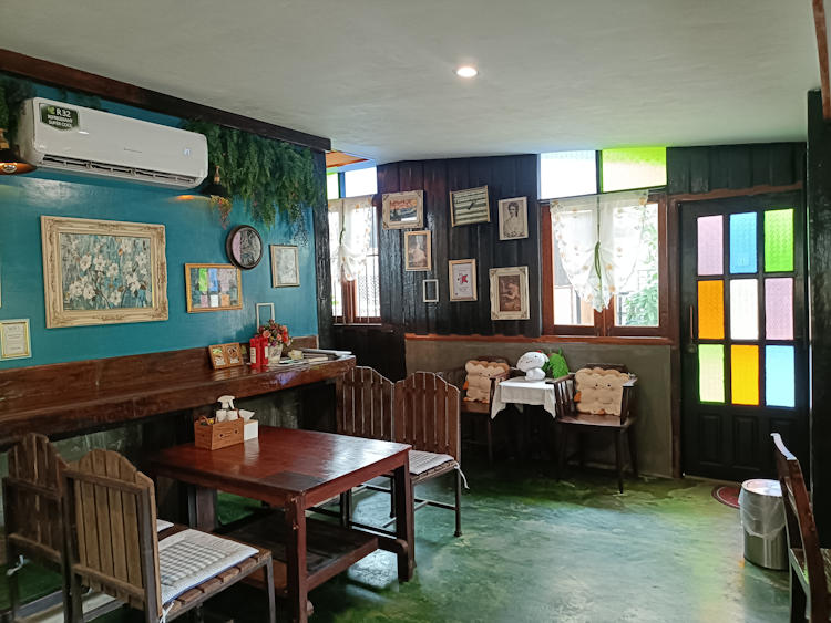 กระจกของร้านก็เป็น ลายสีต่างๆ คล้ายกับกระจกโบสถ์ของคริสเตียน เพิ่มลูกเล่นและความน่าสนใจให้กับตัวร้านได้เป็นอย่างดี โต๊ะที่นั่งก็ทำจาก ไม้หนาๆ ดูแข็งแรงทนทาน ภายในร้านยังมีการตกแต่งด้วย รูปภาพสีน้ำมัน สวยๆ จานชามแนวยุโรป และ รูปปั้นเล็กๆ สไตล์ยุโรป วางประดับอยู่ตามมุมต่างๆ