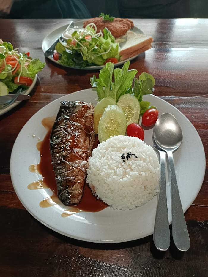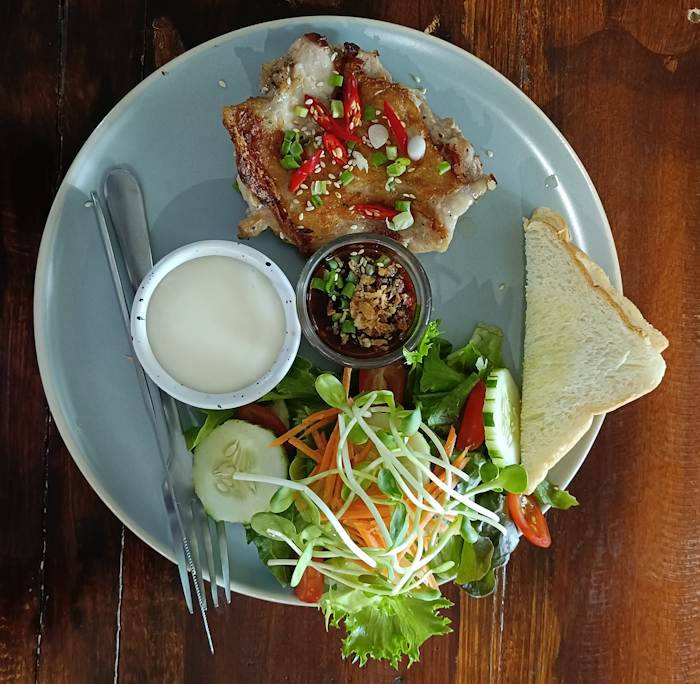 ส่วนเมนูที่ส่วนตัวผมมองว่าสูงเมื่อเทียบกับสภาพเศรษฐกิจของพื้นที่ หรือเรียกได้ว่าราคาน้องๆกรุงเทพฯเลยคือ สเต๊กปลาแซลมอน กับ พอร์คช๊อป ราคาอยู่ที่ 250 บาท ซึ่งในกรุงเทพฯตามร้านอาหารระดับเดียวกันราคาก็จะอยู่ที่ 250 – 290 บาท อันนี้พอเข้าใจได้เพราะต้นทุนของสินค้าประเภทนี้มาสูงอยู่แล้ว และที่นี่เขาใช้ปลาและเนื้อชิ้นโต ถึงแม้ราคาจะสูงแต่เอาจริงๆถือว่าคุ้ม