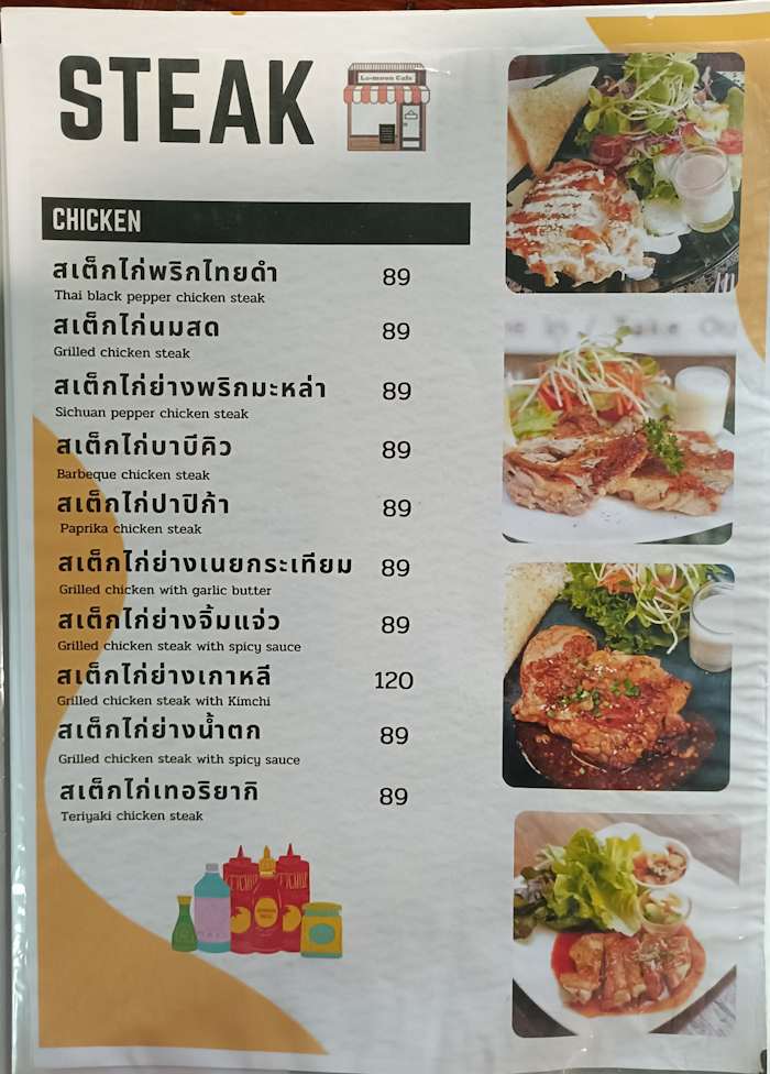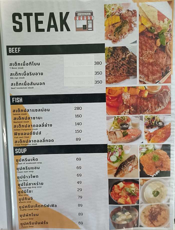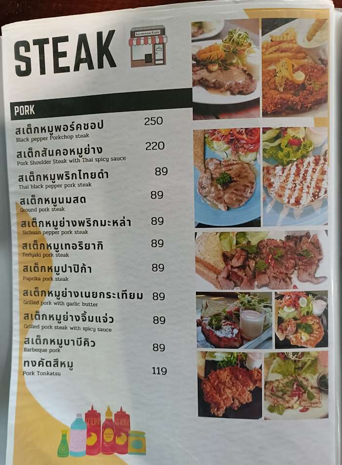 - แนวสเต๊ก: จัดเต็มมากครับ ทั้งสเต๊กเนื้อทีโบน, ริบอาย, สันนอก, สเต๊กหมูสันคอ, พอร์คชอป, สเต๊กไก่, สเต๊กปลาดอลลี่, ไปจนถึงสเต๊กปลาแซลมอน สเต๊กจะมีสองแบบคือสเต๊กแบบธรรมดาๆราคาไม่ถึงร้อย และแบบพรีเมียมราคาสองร้อยบาทขึ้นไป